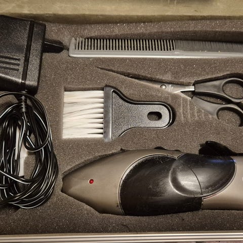 Kommer med maskin, kamsett, tynnesaks og frisørkappe.