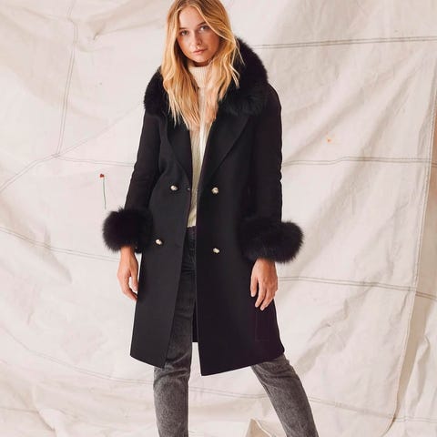 Kåpen er laget i myk cashmere-blanding og har ekte pels på krage og mansjetter.