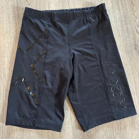 Fin trenings shorts fra 2XU. Med knyting i livet og en liten lomme på siden. Usikker på størrelse ettersom lappen er klippet ut, men den passer fint en XS/S. Den er godt brukt og har derfor noen bruksmerker. Skriften er noe slitt (bilde 5), den har gått opp litt i sømmen på den ene siden (bilde 6) og den har et lite hull bak (bilde 7), alt dette synes lite når man har den på men fortsatt greit å nevne det. Den har også hatt en slags innebygd truse som er klippet ut, og selges derfor billig.