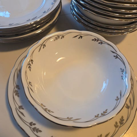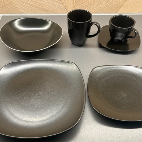 Svart og blå service med 8tallerken, 8 asjetter, 8 skåler og 8 kopp. Ubrukt men uten pakke