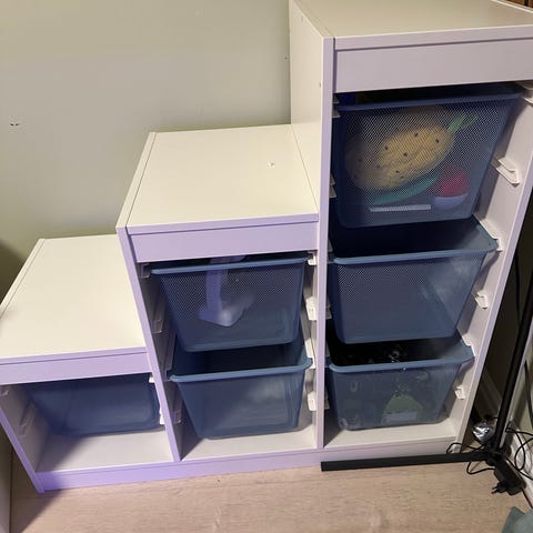 IKEA barnemøbel oppbevaringsenhet med flere plastkasser i grått og gult. Enheten har hyller for organisering og lagring av leker eller andre småting. Passer til barnerom for enkel og oversiktlig oppbevaring.