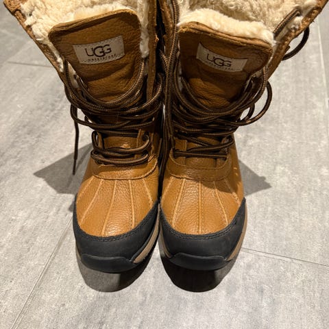 UGG Vinterstøvler i størrelse 38 med brun farge. Laget av mykt materiale med isolerende fôr for varme og komfort. Egnet for bruk i kalde værforhold.