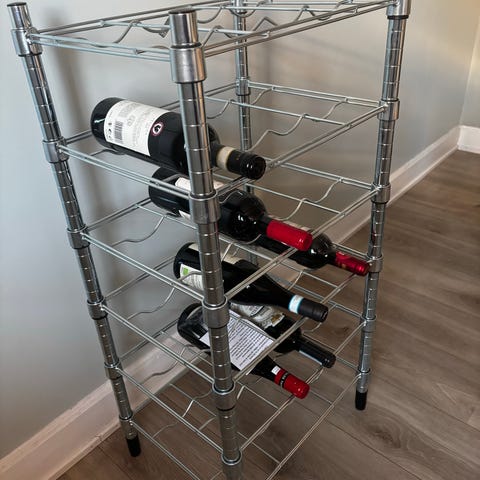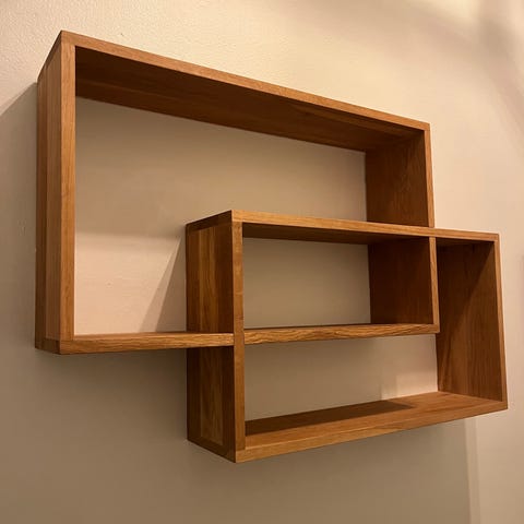 Selger trehylle, jeg kjøpte den brukt, den er tung av godt treverk og i god stand, den festes til veggen med skruer.