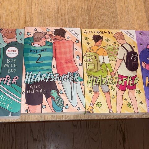 Alice Oseman Heartstopper bokserie bestående av 5 bind. Serien er illustrert og skrevet av Alice Oseman, og inneholder volum 1 til 5. Bøkene er i paperback-format med fargerike omslag som viser ulike scener og karakterer fra serien.