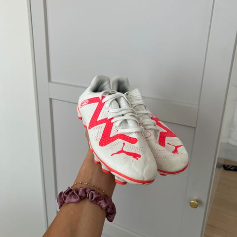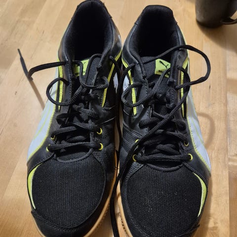 Puma fotballsko for barn i størrelse 33. Skoene har svart og gul farge. Egnet for bruk på innendørs fotballbaner eller andre flate underlag.