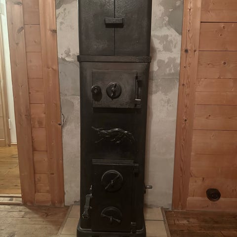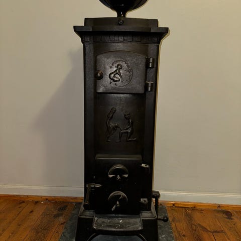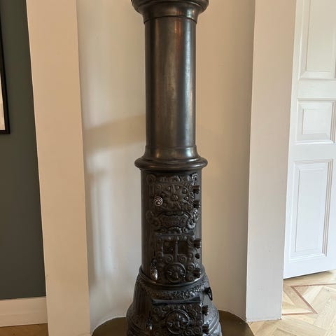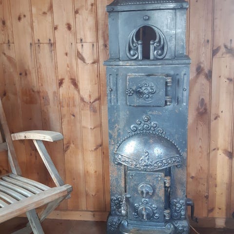 Eldre koksovn med skifer vegger og platetopp. Passer til hjørne. Ukjent alder, men minst 70år gammel. Høyde 108cm, tversover bredde på topplaten er ca 105cm. Må hentes på Talgje i Ryfylke.