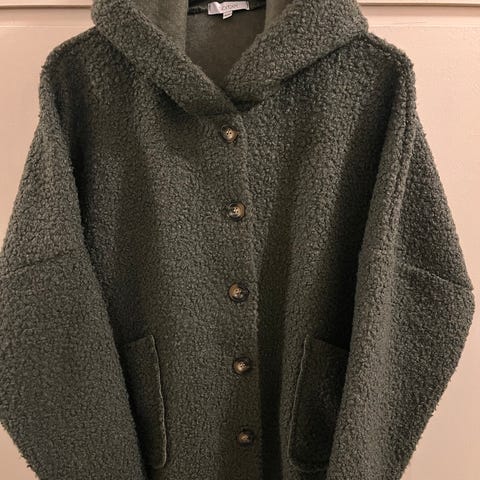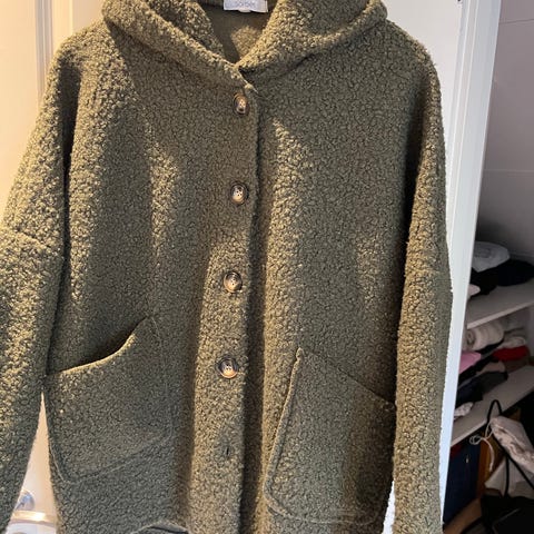 Type teddyjakke fra Sorbet. Ikke foret. Kjøpt nå i oktober. Fin grønnfarge. Klaffelommer foran og glidelåslukning Svært pent brukt