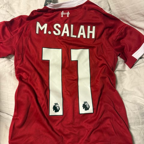 Adidas Liverpool FC fotballdrakt med nummer 9 og navnet Isak på ryggen. Drakten er rød med hvite detaljer, laget i polyestermateriale. Den har Premier League-logo på ermet og Liverpool FC-logo på brystet. Kjøpt på DH gate. Spillerversjonstoff. Størrelse L.