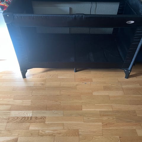 Pent brukt reiseseng med ekstra madrass for bedre komfort. Noen små bruksmerker, men de påvirker ikke funksjonen.