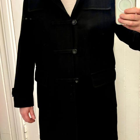 Lite brukt duffelcoat til herre, sort, str XL. Kan sendes mot porto.