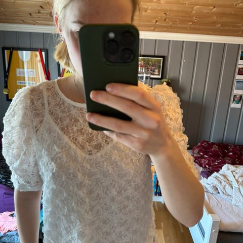 Pudderosa bluse frå Vila. Lite brukt. Ballongermer og ein liten knapp i nakken.