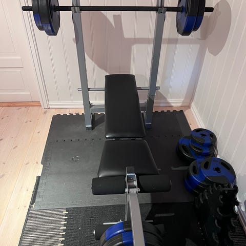 Vektstangbenk Inkluderer vektskiver 15x4 for styrketrening. Egnet for hjemmebruk og styrketrening av overkroppen.