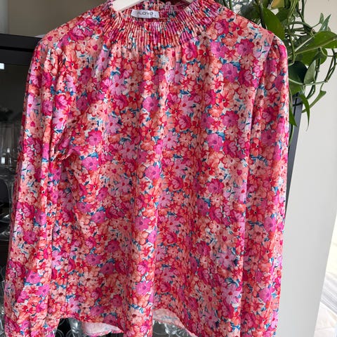 Selger en pent brukt bluse fra Floyd i størrelse S. Blusen er hvit i bunn med nydelig lilla blomster.