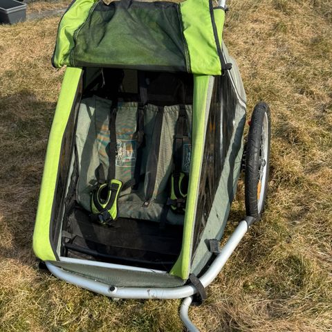 Croozer Sykkelvogn i fargene grønn og grå. Designet for å festes til sykkel og transportere barn eller last. Følger og med hjul og håndtak slik at den kan gjøre om til vogn. Utstyrt med store hjul for enkel kjøring på ulike underlag. Har beskyttende stoff og vindu for sikt og ventilasjon. Alt er helt og fungerer som det skal.