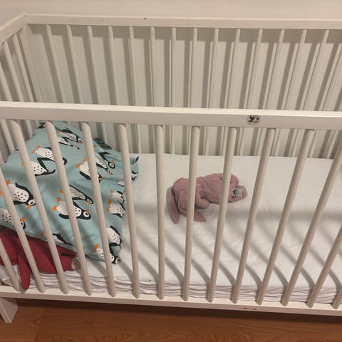 Pent brukt barneseng til salg, noen få bruksmerker. Inkludert gratis er madrass som er nyvasket og ren.