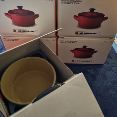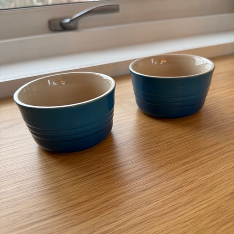Le Creuset Sett med 2 keramiske skåler i blå farge. Skålene er laget i keramisk materiale og egner seg til bruk i kjøkkenet for servering og oppbevaring.