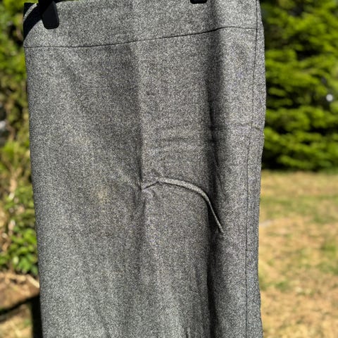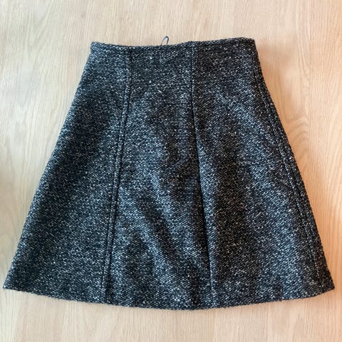 Mørk grått ullskjørt (60% ull) med knyting og lommer.