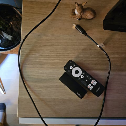 Selger en 1. generasjons Chromecast med USB-kabel.