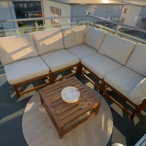 Selger kjekt utemøbel sett i tre bestående av et rundt bord og to benker. Bordet har Settet passer til utendørs bruk og har et rustikt utseende.