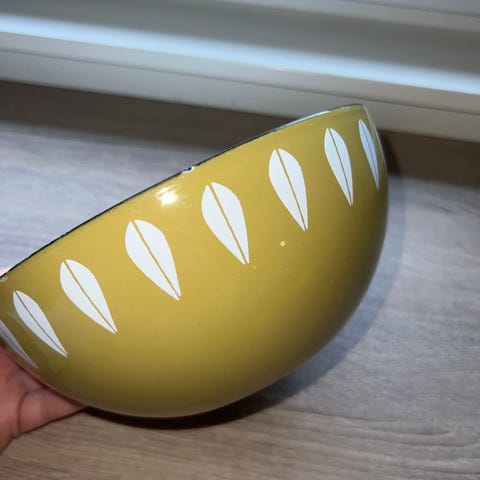 Fin vintage bolle-skål fra Cathrineholm. Lime lotus på hvit bunn. Blank i emaljen. Emajeakade i bunnen i bollen og på undersiden. Se bilder. Ellers i fin stand.