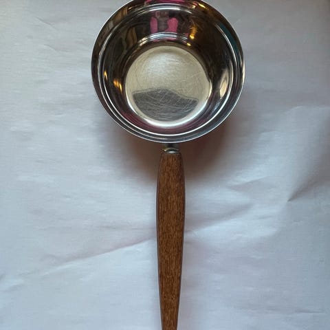 Retro smørsmelter med håndtak i teak. Har noen merker, men fremstår som pen.