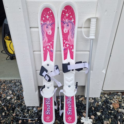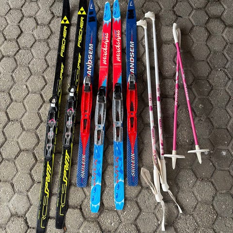 Blå barneski med tilhørende bindinger og røde staver. Skiene og stavene er laget for barn og har en enkel design. Skiene har festebindinger for vanlige sko.