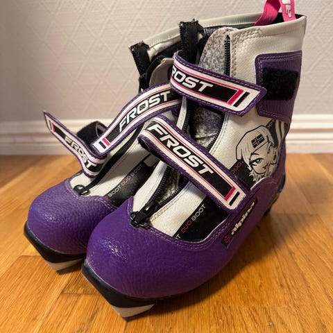 Blå barneski med bindinger og røde staver