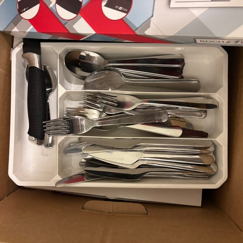 Ubrukt, kun stått i et vitrineskap. Kan få med 6 ubrukte rødvinsglass av ukjent merke for 50kr.