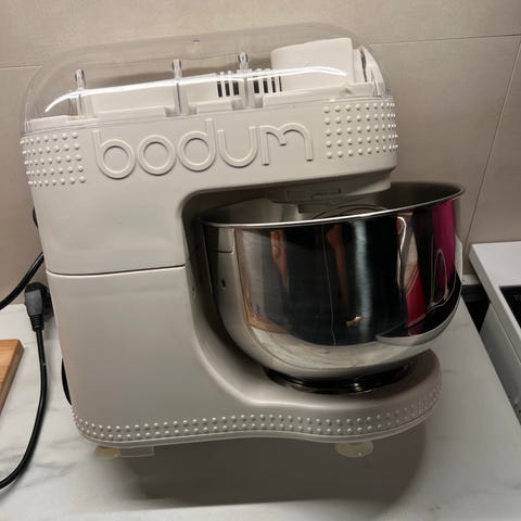 Bodum kjøkkenmaskin med rustfri stålbolle og vispe- og eltekroker. Egnet for baking og matlaging, med justerbar hastighet og sikkerhetslokk.