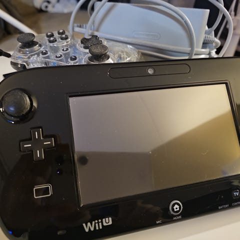 Nintendo Wii konsoll med tilhørende strømadapter. Strømkabelen fungerer men har slitasje i kantene.