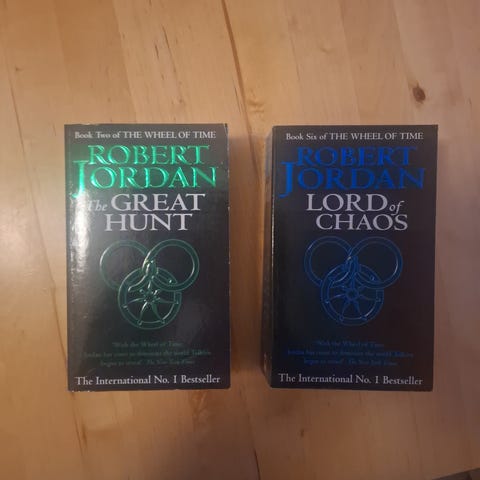 Bøkene er på engelsk og er pent brukt. De inngår i serien The Wheel of Time. Har bøkene 1, 2, 3 og 5.