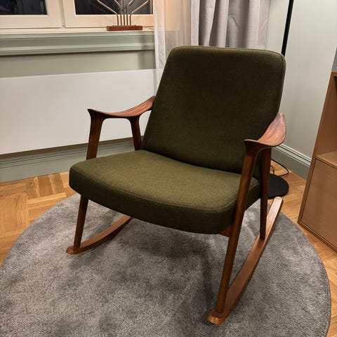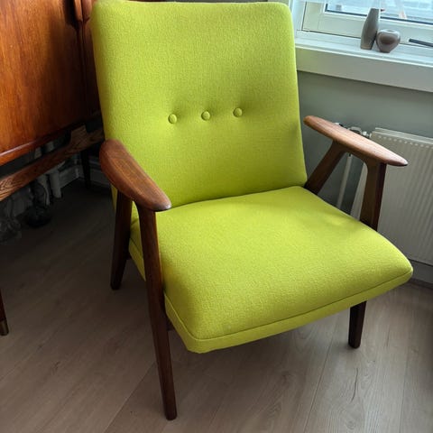 Meget behagelig og vakre former. Et godt eksempel på god, norsk design. Stolen fremstår som ny.