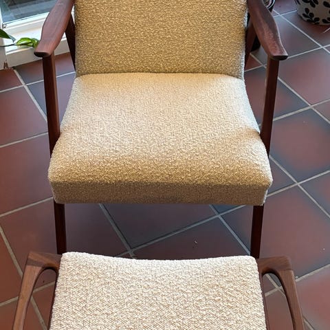 Treverk er teak, som er pusset ned, renset og oljet. Stolen har fått ekstra stopping og et pent og moderne, beige/off-white bouclé møbelstoff.