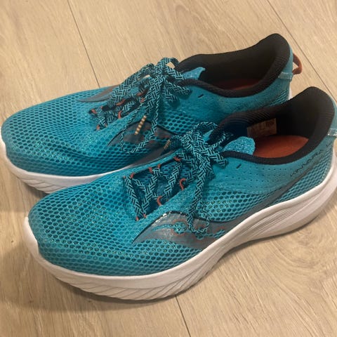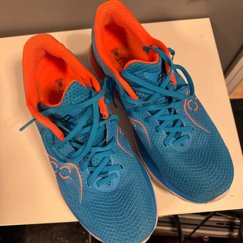 Saucony løpesko i størrelse 43, med hvit overdel og rød såle. Designet for løping med pustende materiale og demping tilpasset sportstypen.