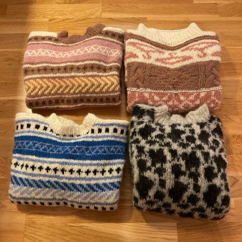 Den burgunderrøde og den stripete er nye av året. Det er forskjellige str, men alle passer en XL.