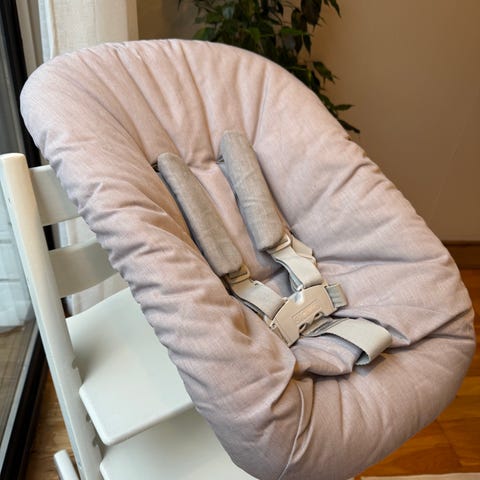 Stokke Nomi Newbornset med grå/sand tekstiltrekk. Følger med Nomi leketøyhenger som enkelt festes på setet. Er meget pent brukt.