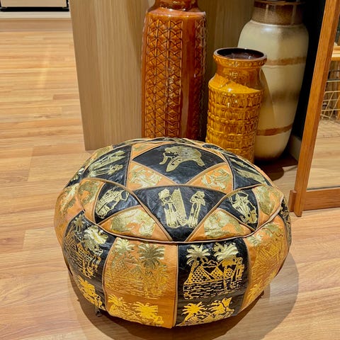 Håndlaget skinnpuff fra Marokko. I god stand, med lett slitasje. Glidelås er helt inntakt.