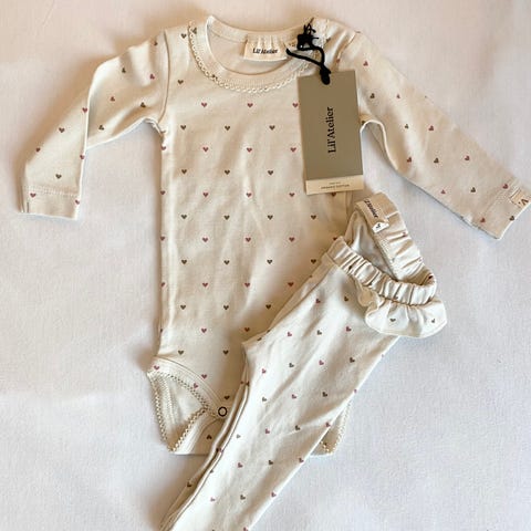 atelier som dessverre var for små da de skulle tas i bruk. Nydelig lite sett til jente med søt krage og deilig stretchstoff. Kun skylt opp forsiktig, aldri brukt☺️