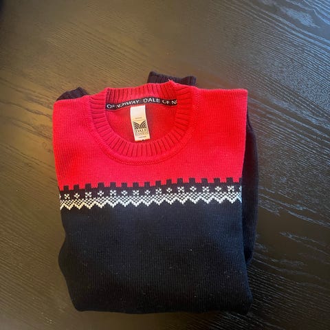Dale of Norway Genser i gul farge, størrelse M for dame. Genseren er laget av merinoull og har tradisjonelt norsk mønster. Den har glidelås i halsen med dekorative detaljer.