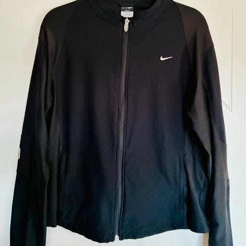 Str. 170. Sportsjakke med tommelhull. Jakken er blå og har en langt erme. Den har figurnær passform, en glidelåslukking foran, elastisk materiale, polokrage og sømmer foran og bak.