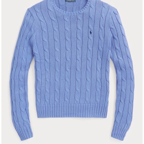 Polo Ralph Lauren genser i blå bomull, størrelse 122, unisex. Genseren har et klassisk kabelstrikket mønster og rund hals.