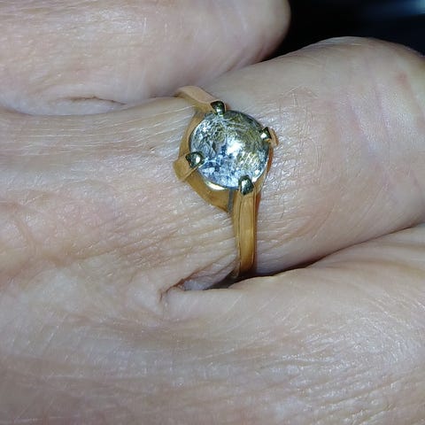 Ring i gull med diamantdetaljer, designet for dame. Ringen kombinerer gullmateriale med innlagte diamanter, og kan brukes som smykke til ulike anledninger.