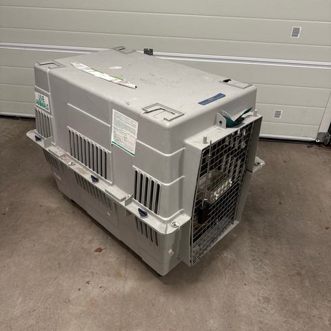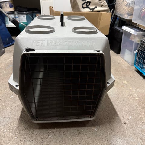 Reisebur for kjæledyr gis bort mot henting. Buret har mesh-paneler for ventilasjon og glidelåser på alle sider for enkel tilgang. Laget med ramme i metall og stoffmateriale. Passer for transport og midlertidig opphold for kjæledyr. En av rammene er brukket men buret holder seg fortatt greit oppe.