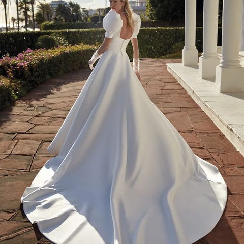 🤍 En moderne og minimalistisk kjole som har et elegant uttrykk. Snøring i ryggen som fremhever midjen og et nydelig og og fyldig A-linjet skjørt.