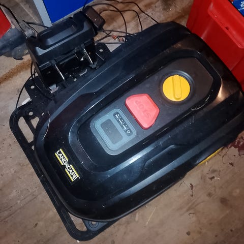 Landxcape 400 robotgressklipper med ladestasjon, grensekabel og plugger for å feste grensekabelen.