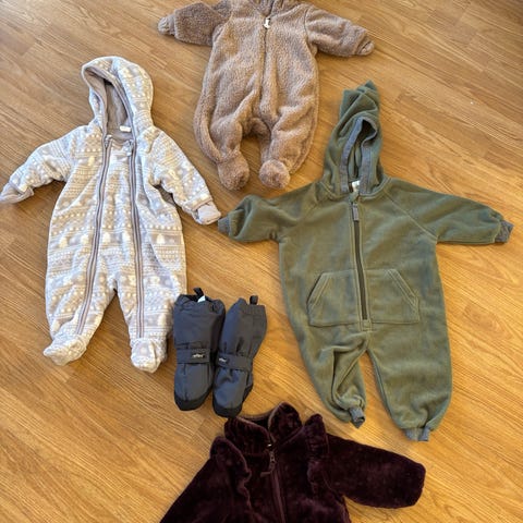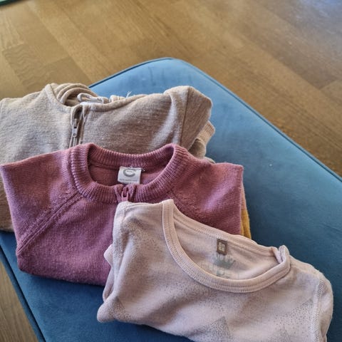 Rosa i blomster fra h&m i 62 brukt 2 ganger. Rosa ulldress fra cubus i 50/56 brukt 2 ganger. Resten i 50/56. Rosabeige dress fra huttelihut i 50/56 brukt få ganger. Denne er finere i virkeligheten enn på bildet. Ingenting er vasket.
