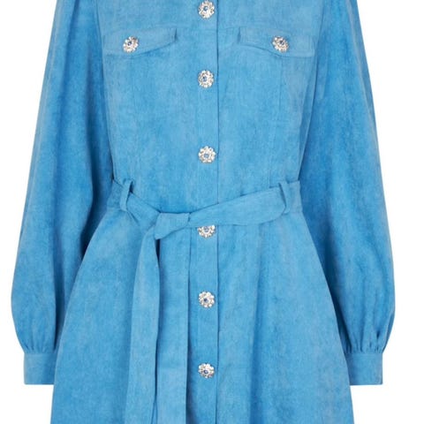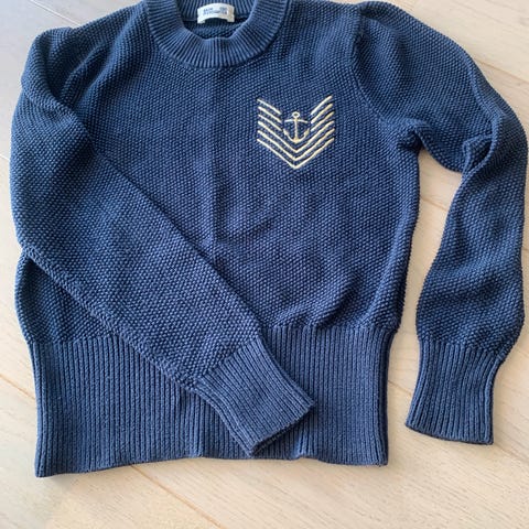 Genseren er glitrende og mørkblå med fargerike detaljer på ermene og bunnkanten.
