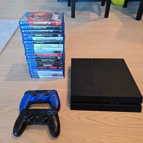 Sony Playstation 4 hvit konsoll med en svart kontroller. Inkluderer fire FIFA-spill: FIFA 23, FIFA 22, FIFA 21 og FIFA 20. Konsollen er beregnet for spill på Playstation 4-plattformen.