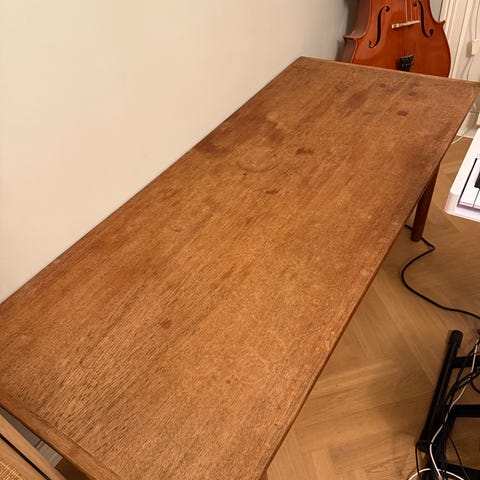 Bordet er generelt hel, pen og ren. Det er imidlertid noen merker i bordplaten, som med fordel kan pusses lett bort og evt. lakkes/oljes over for et helt jevnt uttrykk. Ellers i god stand.