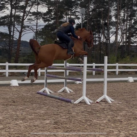 Vi har tatt det veldig rolig - startet opptil 110cm. Har bevisst tatt det rolig for å bygge styrke og ridbarheten. Han er uredd og forsiktig, med potensial/kapasitet.